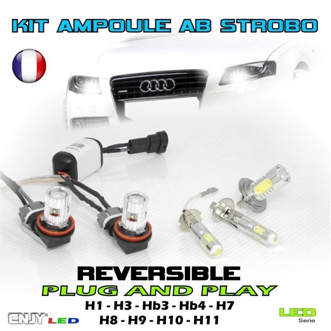 Kit LED MSR avec ampoule anti brouillard et phare stroboscopique - Plug and play - Pour ampoules : H1-H3-HB3-HB4-H7-H8-H9-H10-H11-H16 - En Version: Rendu : 11W - 25W - 50W ou 80W CREE led- Eclairage Blanc Pur. (Orange ou bleu sur commande) - +600 à 1300 Lumens. Vendue par paire