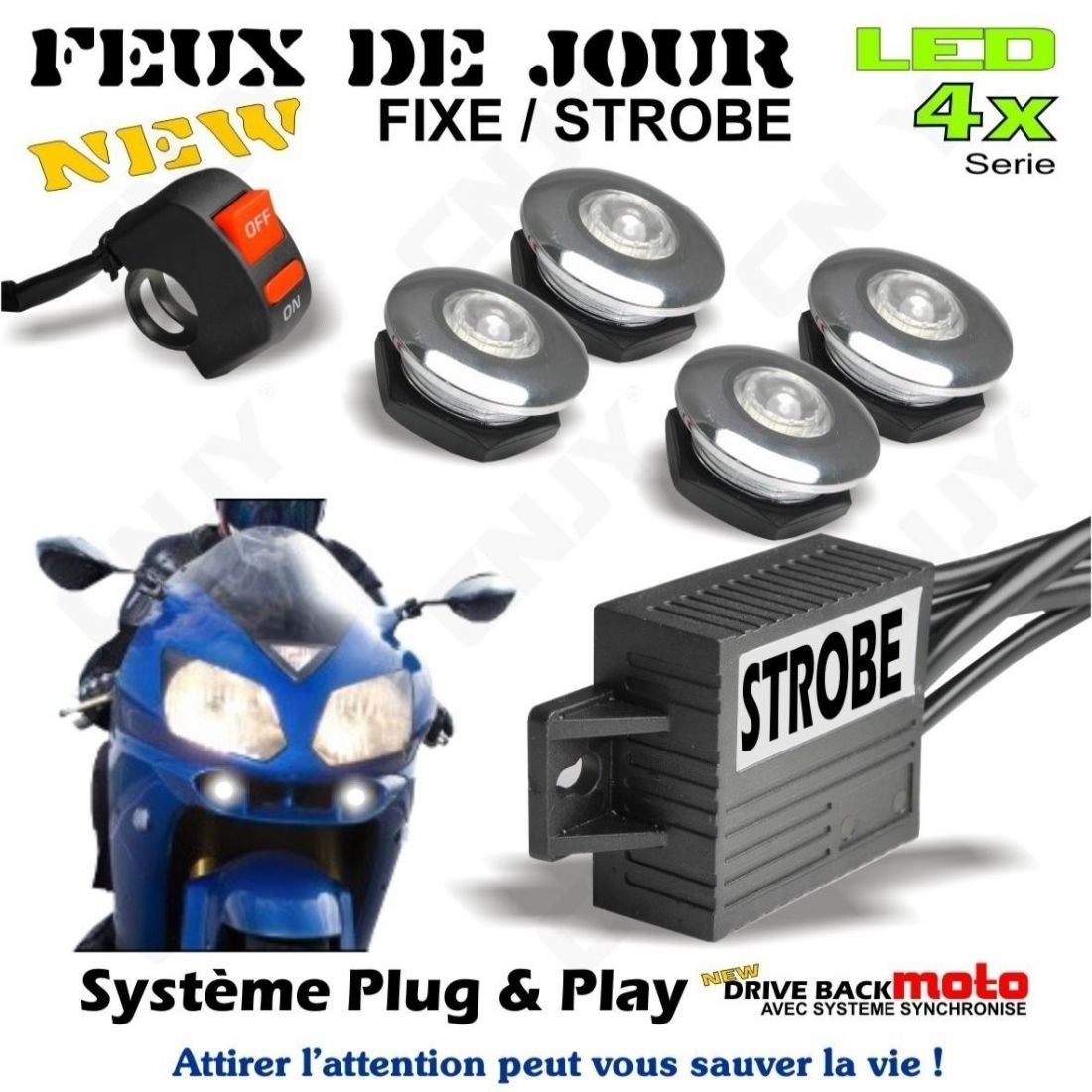 Et le câble de l'interrupteur (fournis) vous permettra de mettre vos feux de jour en marche en mode strobo.